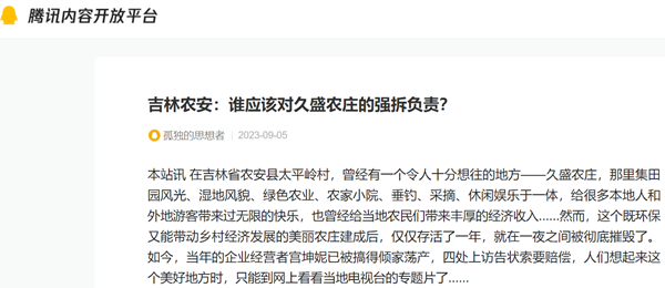 本站讯 在吉林省农安县太平岭村,曾经有一个令人十分想往的地方——久盛农庄,那里集田园风光、湿地风貌、绿色农业、农家小院、垂钓、采摘、休闲娱乐于一体,给很多本地人和外地游客带来过无限的快乐,也曾经给当地农民们带来丰厚的经济收入......然而,这个既环保又能带动乡村经济发展的美丽农庄建成后,仅仅存活了一年,就在一夜之间被彻底摧毁了。如今,当年的企业经营者宫坤妮已被搞得倾家荡产,四处上访告状索要赔偿,人们想起来这个美好地方时,只能到网上看看当地电视台的专题片了......
