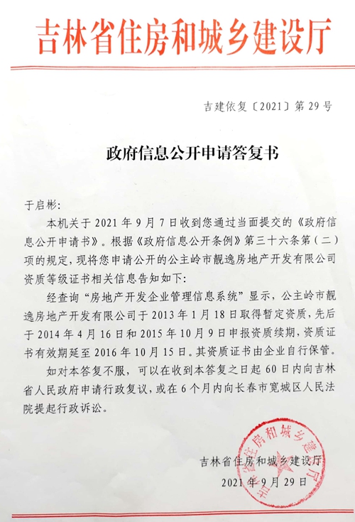 1,吉林省住房和城乡建设厅吉建依复【2021】第29号《政府信息公开申请答复书》证明张淑丽开发资质早已经过期。该文件称:经查询“房地产开发企业管理信息系统”显示,靓逸公司于2013年1月18日取得暂定资质,先后于2014年4月16日和2015年10月9日申报资质续期,资质证书有效期延至2016年10月15日。其资质证书由企业自行保管。