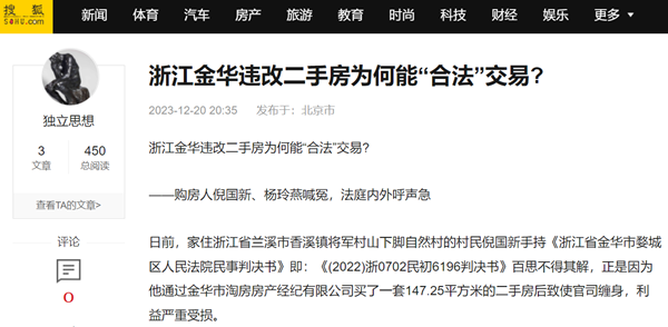 2023年12月20日上午,金华市淘房房产经纪有限公司法人代表董伟财说:“金华市二手房市场有90%以上的房源存在原房主私自改建现象,因为没人举报,这事在金华市二手房市场上就成为心照不宣的事实,当地各级法院也不会支持类似违章改造引发的民事纠纷案件。所以,倪国新、杨玲燕在一审提出反诉和二审中院提出上诉,两级法院是不会支持的。”