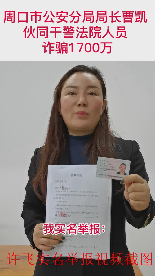 21年底,我们在周口市见到投诉人许飞,大致了解到事情经过是:2014 年 4 月,许飞经人介绍认识了时任周口市公安局金海路分局局长的曹凯,当时曹凯告知说周口市政法系统有重大的商业项目,可以资金运作,其借款 800 万元,用期 2 个月,以周口市中级人民法院查封的楼盘资料作为抵押,并拿出了该法院的查封材料和印章手续为证,许飞认为分局局长身份的曹凯不会失约,就相信了他,果然该笔款项 2 月后陆续按时归还给了。同年 8 月 8 日,曹凯又以上述商业项目运作为由,又以借款形式向投诉人许飞借1700万元(除 204万元现金外,其余为银行转账),用期 2 个月,仍然以周口市中级法院查封的楼盘的有印章手续原件作为抵押,为让许飞放心这次有张晓明(周口市公安局情报中心民警)、朱献春、张晓莉、袁向一、刘静等 7 人做担保人和承诺书,且周口市中级法院以书面形式出具了该担保人的身份证明。然而这次,曹凯却违约了,许飞多次催款无果,许飞就开始找担保人要求还歉,但仍无结果。后来经了解,曹凯等人所称的周口市政法系统有重大的所谓商业项目纯属虚构,是不存在的事情。曹凯在第一次的借款中是试探控告人,故意按期返还借款,使控告人信以为真,导致第二次“借款”容易得手。许飞还了解到,曹凯当时是与周口市中级法院部分法官采取虚构事实、共谋骗取控告人巨额钱款,造成许飞巨额财产损失。期间,许飞每年多次找被控告人要求返还钱款,但曹凯等人一直躲遊、藏匿,此钱款至今未能追回。许飞找到张晓明(周口市公安局情报中心民警),张不但不积极想办法解决事情却威胁许飞“那你等着,再找我想法也给你送进看守所”。曹凯也居然说出“你告我吧,就是进监狱我一辈子也挣不来这么多钱......”,其爱人还威胁许飞说“有本事想去哪告都行,只要能告赢有的是钱......”他们行为给控告人及其家人造成的身心和精神上的危害是深重、无法弥补的。曾几何时,那高悬于公堂之上“公正清廉,为人民服务”的明镜,在利令智昏的灰尘里成为仅供观赏的卷轴。我们与当地律师交流,他们认为十八大以来国家法律法规纪律条例明确规定国家公职人员严禁经商参与经营牟利,否则将会受到党纪国法的处理,若采取虚假项目借款不还还可能构成“诈骗”。经了解,曹凯事后仅受到撤职处分,但他们应该比任何人都明白作为法官该承担的责任和义务。