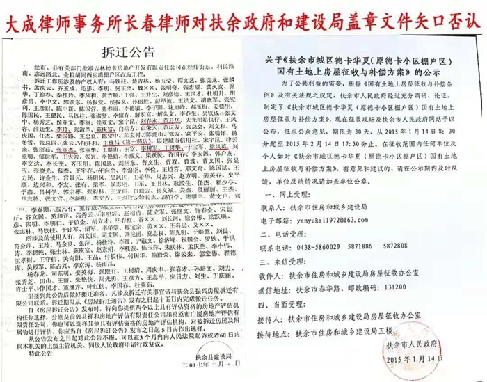本站讯 2021年7月23日,吉林省松原市中级人民法院第八审判庭内,扶余市政府起诉德卡公司(全称:吉林省德卡房地产开发有限公司)产权置换协议纠纷一案正在审理。当德卡公司提交扶余市住建局的拆迁公告和扶余市政府的征收公告及省软环境办协调会议纪要,以证明此案中德卡不存在违约行为、是政府不作为导致迟延履行时,戏剧性的一幕出现了——作为扶余市政府法律顾问的北京大成律师事务所(以下简称大成所)长春分所律师的刘颖,居然矢口否认经扶余市政府盖章发布的征收公告,偷换概念,也不承认吉林省软环境办曾经组织过扶余市华夏棚户区改造协调会。而当德卡公司拿出铁证证明此事后,该律师立即声音嘶哑,声称血压升高!