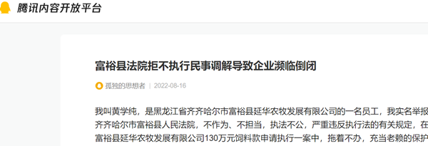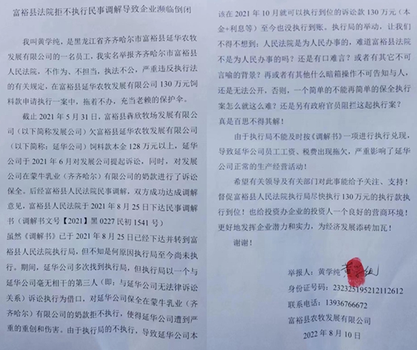 我叫黄学纯,是黑龙江省齐齐哈尔市富裕县延华农牧发展有限公司的一名员工,我实名举报齐齐哈尔市富裕县人民法院,不作为、不担当,执法不公,严重违反执行法的有关规定,在富裕县延华农牧发展有限公司130万元饲料款申请执行一案中,拖着不办,充当老赖的保护伞。