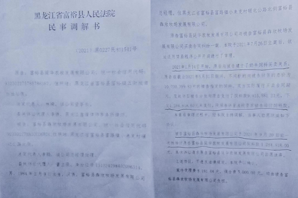截止2021年5月31日,富裕县犇欣牧场发展有限公司(以下简称发展公司)欠富裕县延华农牧发展有限公司(以下简称:延华公司)饲料款本金128万元以上,延华公司于2021年6月对发展公司提起诉讼,同时,对发展公司在蒙牛乳业(齐齐哈尔)有限公司的奶款进行了诉讼保全。后经富裕县人民法院民事调解,双方成功达成调解意见,富裕县人民法院于2021年8月25日下达民事调解书(调解书文号【2021】黑0227民初1541号)。