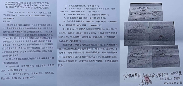 2024年3月20日未栽树时,李德富的驻马店市德富综合开发有限公司已经向遂平县林业局陈局长、乡林管所建新所长以及赵庄村陈书记报备,并且得到他们的同意后才开始栽树。因为栽树需要很多工人,山上原来的房子倒塌无法居住,于是我们重新购买移动板房临时居住。2024年4月13日上午,遂平县嵖岈山镇政府方镇长,镇土地所秦所长,县土管局执法大队等23人以及4辆执法车突然来到驻马店市德富综合开发有限公司承包的卧虎山庄。所有执法人员没有出示任何有效证件,污蔑我们公司有施工行为,在未出示任何手续的情况下强行拆掉卧虎山庄旅游观光牌子,拆走3台挖机的电路板、电瓶、电脑,还有5套活动板房。