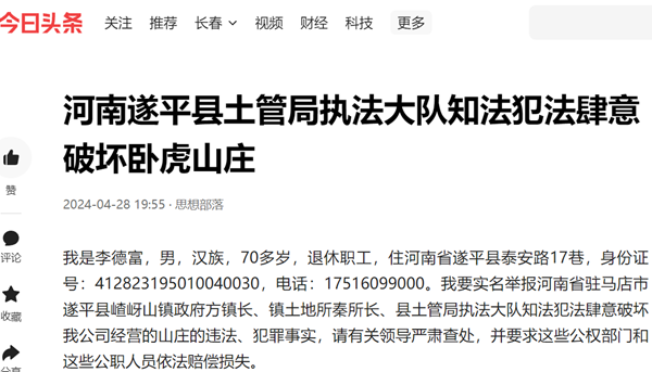 我是李德富,男,汉族,70多岁,退休职工,住河南省遂平县泰安路17巷,身份证号:412823195010040030,电话:17516099000。我要实名举报河南省驻马店市遂平县嵖岈山镇政府方镇长、镇土地所秦所长、县土管局执法大队知法犯法肆意破坏我公司经营的山庄的违法、犯罪事实,请有关领导严肃查处,并要求这些公权部门和这些公职人员依法赔偿损失。