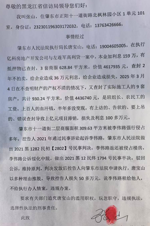 肇东市人民法院执行局长唐宝山(电话:19004605005),在执行亿科房地产开发公司与左连军高利贷一案中,本金加利息159万,有抵押物已查封,3套商服628.84 平方米,价值4617935元,查封2年不拍卖,给企业造成36万元利息,给企业造成损失。2025年3月4日在不查明财产的产权不清的情况下,其又查封了实际施工人的9套房产,共计930.24平方米,价值4436740元,是班组长、农民工的工资,上百人的血汗钱,半年多没变现,有上访的、告状的、要上吊的,错误查封导致上亿元项目滞销,损失及利息100多万元。