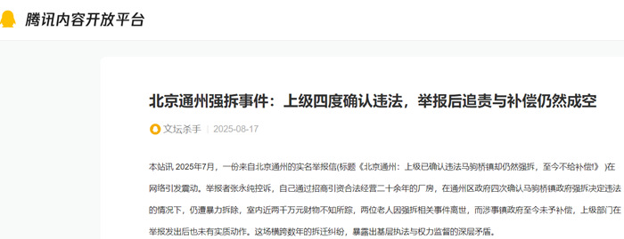 本站讯 2025年7月,一份来自北京通州的实名举报信(标题《北京通州:上级已确认违法马驹桥镇却仍然强拆,至今不给补偿!》 )在网络引发震动。举报者张永纯控诉,自己通过招商引资合法经营二十余年的厂房,在通州区政府四次确认马驹桥镇政府强拆决定违法的情况下,仍遭暴力拆除,室内近两千万元财物不知所踪,两位老人因强拆相关事件离世,而涉事镇政府至今未予补偿,上级部门在举报发出后也未有实质动作。这场横跨数年的拆迁纠纷,暴露出基层执法与权力监督的深层矛盾。