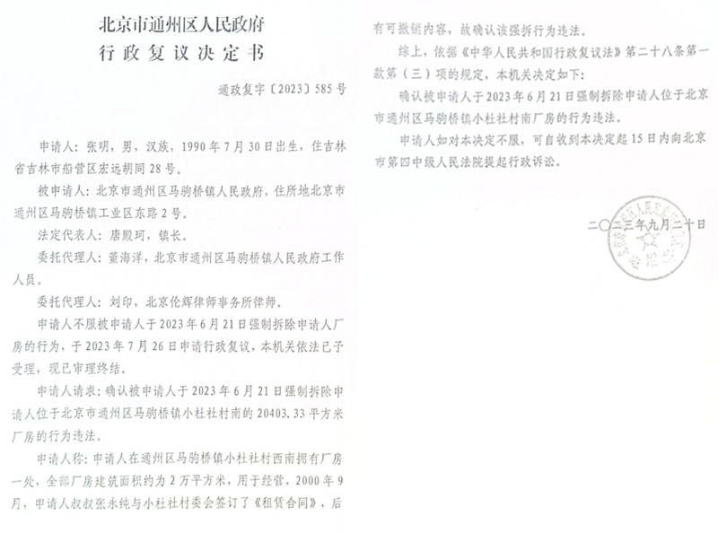 ——2023年9月,通州区政府第四次作出复议决定,明确马驹桥镇政府6月20日的强拆行为违法。