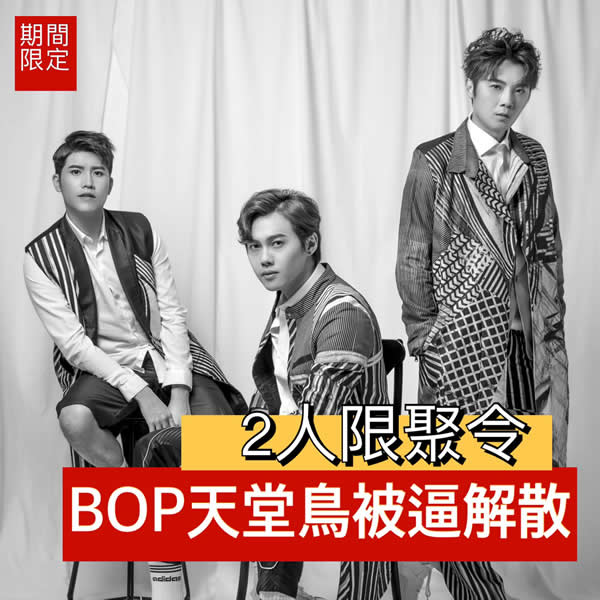 12小时新闻网讯 (通讯员 任逍遥)男子跳唱组合天堂鸟(BOP)有三位成员,但因近日实施两人限聚令,故组合在社交平台宣布暂时“被迫解散”!Gordon笑说还好在限聚令实施前, 完成了三人一起的录影工作:「后续暂时不用一起工作,因为很多工作都延期及取消了。」
